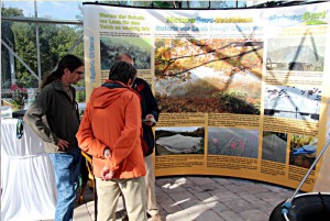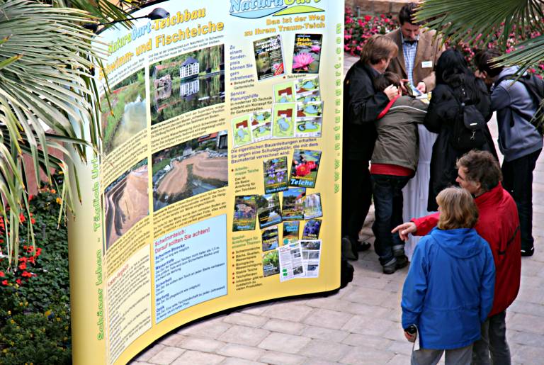 Im Mittelpunkt der Veranstaltung standen die Information über Bau und Unterhaltung von Teichen. In der fertigstellten Palmenhalle konnten sich Interessierte an Themenständen informieren und beraten lassen. Die Themenbreite reichte von der Orientierungshilfe für die Neuanlage und Sanierung von Teichen, über Techniken der Teichabdichtung, Bau des Teichufers, Schachtbau, Stege und Brücken bis hin zu Laubschutznetzen und Pflanzen Sortimenten für den Filtergraben und Gartengestaltung.