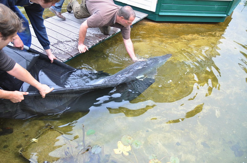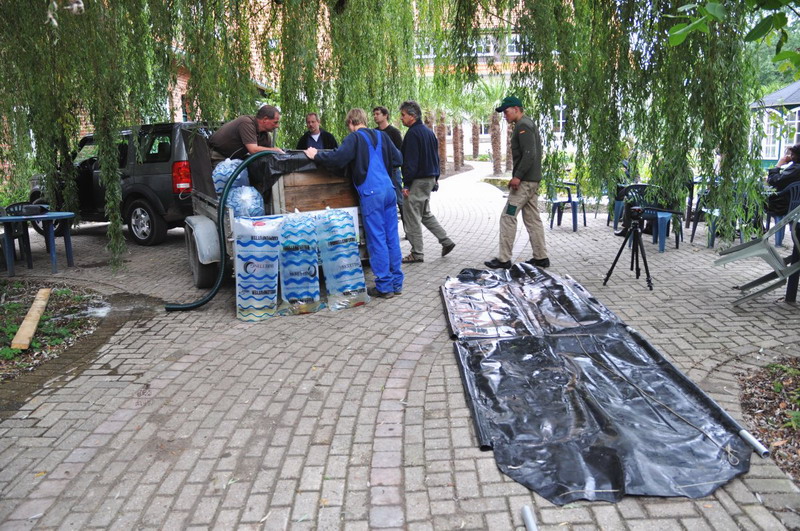 Mit einer Folientrage wurde der Stör aus dem mit Teichfolie ausgekleideten Hänger gehoben und über kurze Wege direkt zu seinem Schwimmteich am NaturaGart Verwaltungsgebäude gebracht.