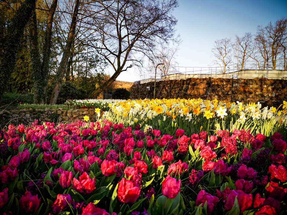 Viele Narzissen sind schon verblüht, doch Tausende von Tulpen sorgen für feurige Farbenpracht im NaturaGart-Park.