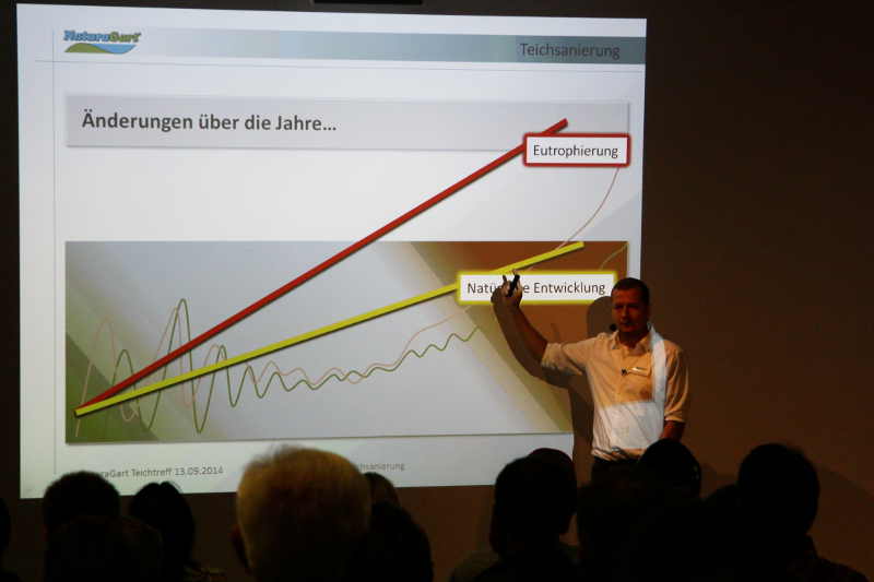 Vorträge zu unterschiedlichen Teichthemen werden geboten. Hier geht es um die Biologie in Gartenteichen.