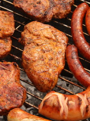 Würstchen - marinierte Hänchenbrustfilets - Schweinesteaks - Wedges Kartoffelecken - zwei hausgemachte Dips - Baguette, Ciabatta - rustikale Salatauswahl - ...und ein vegetarisches Gericht