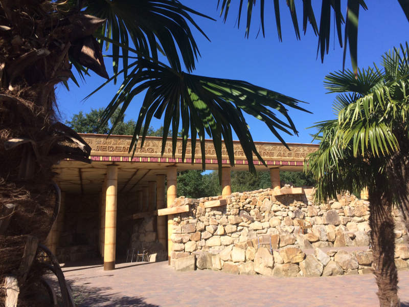Der Tempel im NaturaGart Park entstammt natürlich nicht der Antike. Auch wenn das auf den ersten Blick vielleicht so aussehen mag. Nein, er wurde aus Betonfertigteilen zusammengesetzt und erhielt anschließend von einem Wandmaler sein altertümliches Gewand. Die Fassade wurde in einem Sandsteinfarbton angemalt, der den Vorbildern im alten Rom wie auch im Athen der klassischen Antike nachempfunden ist.