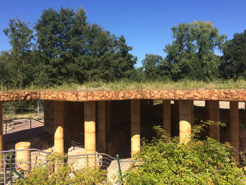 Das Dach ist begrünt und die ganze Anlage verschwindet immer mehr hinter einem Dickicht aus Pflanzen.