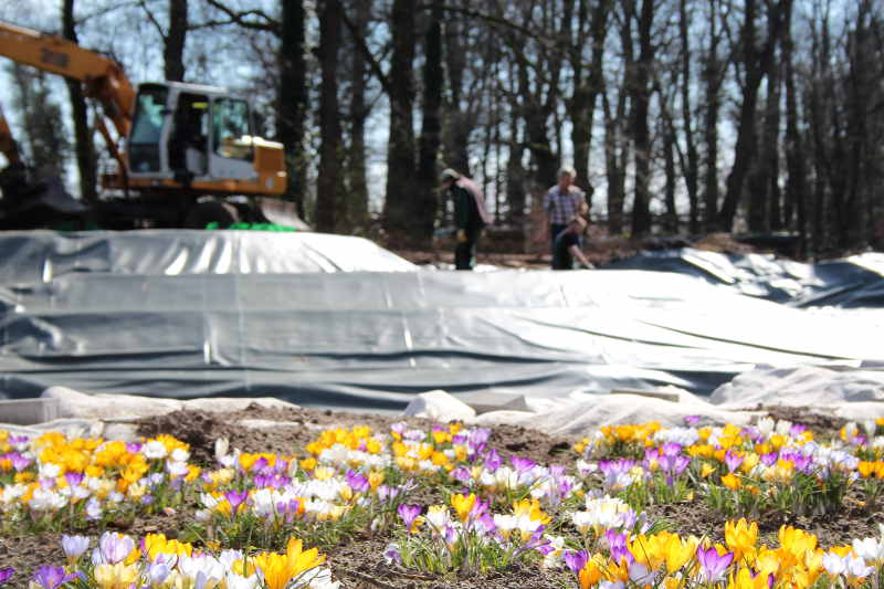 Teichbau im Park – hier können verschiedenste Teichformen begutachtet werden. Im Bild: Der Bau eines riesigen Wasserfalls.