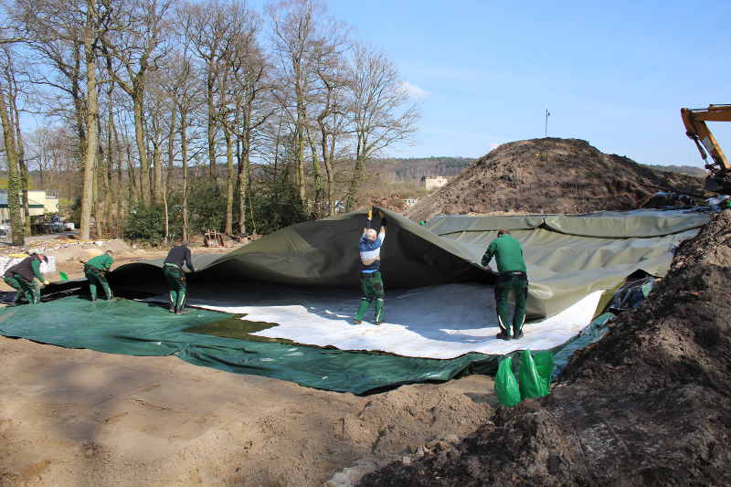 Robuste Teichfolie ist eine gute Voraussetzung für einen dauerhaften Gartenteich. Am zukünftigen Spielplatz wird eine Wasserfall-Landschaft gebaut.