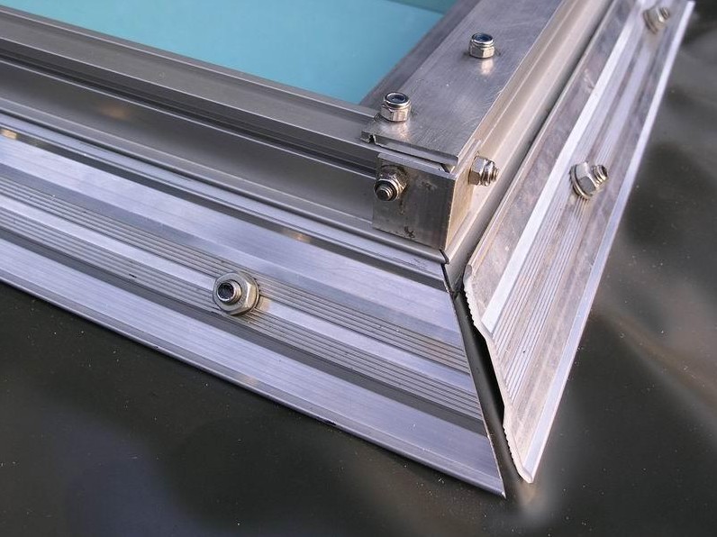 Das wichtigste Problem: Die Teichfolie lässt sich nicht direkt am Glas befestigen. Vielmehr braucht man eine Einfassung, die auf der einen Seite die Folie einklemmt und auf der anderen Seite das Glas trägt.