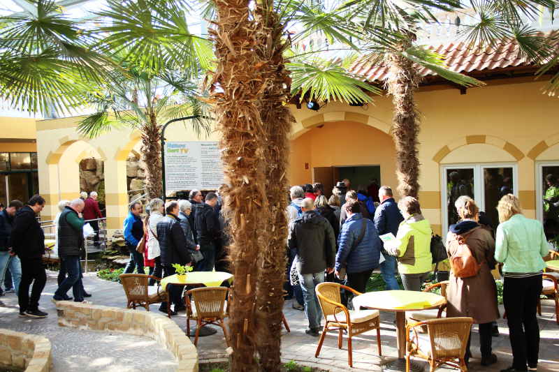 Hier warten Seminarteilnehmer am Eingang zum Hörraum, wo der Theorie-Teil des Teichpflege-Seminars gehalten wird.