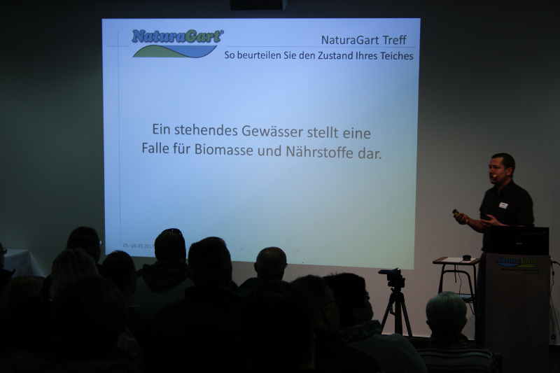 Beim anschließenden Rundgang durch den NaturaGart Park wird die Theorie an Beispielteichen veranschaulicht und vertieft. Die unterschiedlichen Möglichkeiten der Messung von Wasserparametern werden vorgestellt. Dabei werden die Grenzen und der Nutzen der einzelnen Methoden aufgezeigt. Auch die verschiedenen Filtermethoden, die unterschiedlichen Möglichkeiten der Sedimententfernung und die Wartung der Filtertechnik werden anhand praktischer Beispiele im NaturaGart Park vorgeführt. Ein weiterer Teil des Teichpflege-Seminars behandelt die Erarbeitung von Pflegeplänen und das Identifizieren von Symptomen, die über den möglichen Sanierungsbedarf eines Teiches Aufschluss geben.