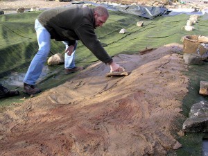 Dafür wird die Fasermatte auf die Folie geklebt und mit Teichbau-Mörtel eingeschlämmt. Kinder wollen spielen. Da braucht man nicht über die Belastbarkeit der Baustoffe zu diskutieren - das Material sollte im Idealfall unzerstörbar sein. Egal ob fischender Reiher, verirrte Kuh, scharfkralliger Hund oder destruktiver Nachbar: Eine mit Verbundmatte gepanzerte Folie hält alles aus. Weiterer Vorteil: Der Mörtel läßt sich anfärben. Nichts erinnert mehr an einen Folienteich. Eine natürliche Teich-Optik: das ist das Ziel. Je nach Verarbeitungsweise kann die Oberfläche naturnah rauh oder fliesenglatt gestaltet werden.