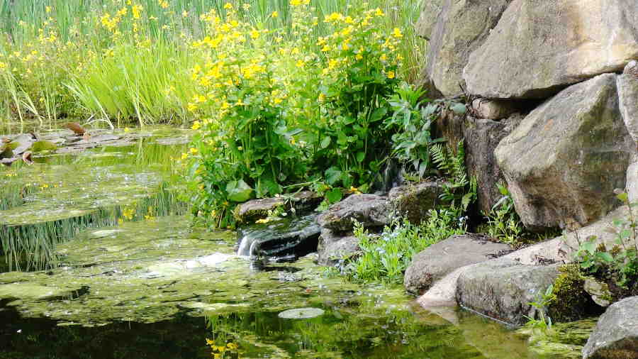 Wer zuerst kommt malt zuerst, lautet ein anderes Sprichwort. Das gilt auch für die Minialgen. Sie sind am schnellsten, wenn es darum geht, von der im Frühjahr im Teichwasser auftretenden Nährstoffschwemme zu profitieren. Die kleinen Algen absorbieren zwar viele Nährstoffe, sie färben allerdings auch das Wasser grün. Das Auftreten der Minialgen kann man verhindern, indem man im Filtergraben Fadenalgen auf den Blättern der Unterwasserpflanzen des Vorjahres platziert. Denn dadurch wird den kleinen Teichpflanzen im Gartenteich die Ernährungsbasis entzogen.
