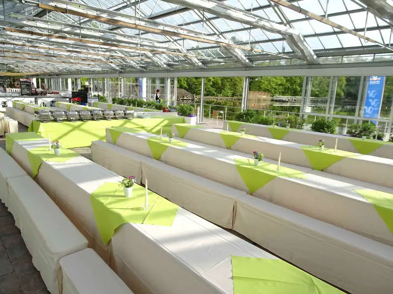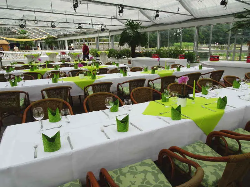 Bei kleineren Gruppen können wir den Raum mit Pflanzcontainern in Bereiche z.B. für einen Sektempfang unterteilen.