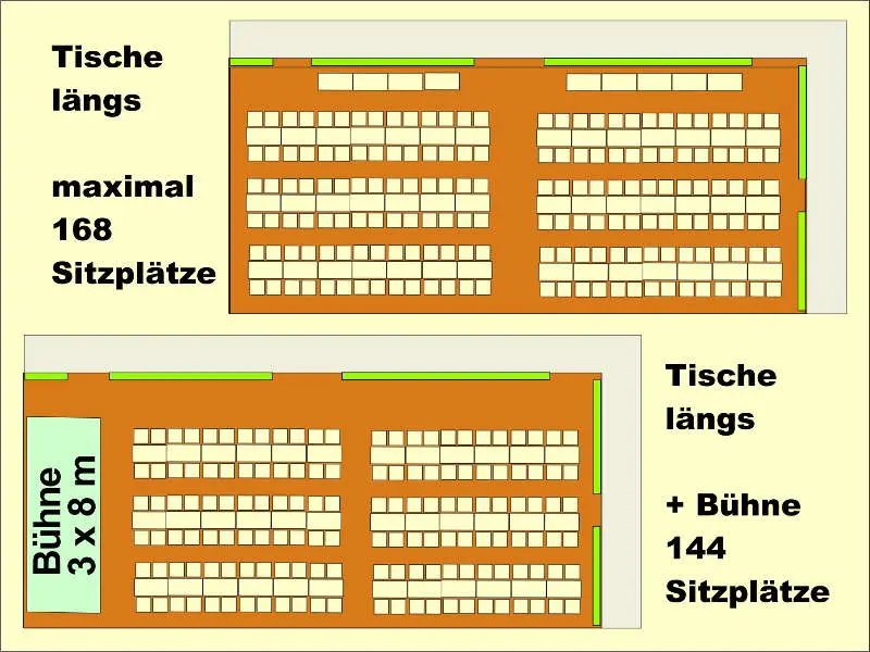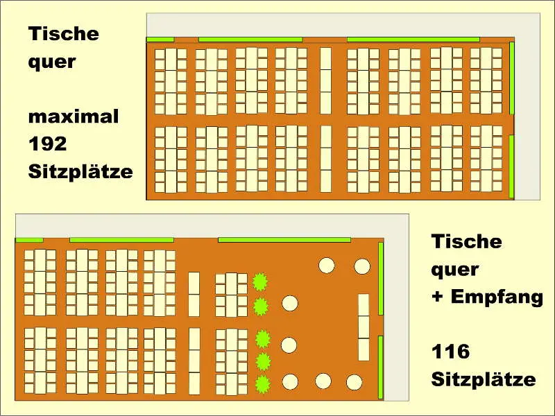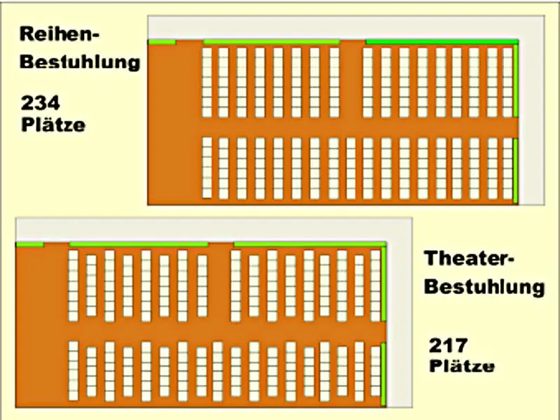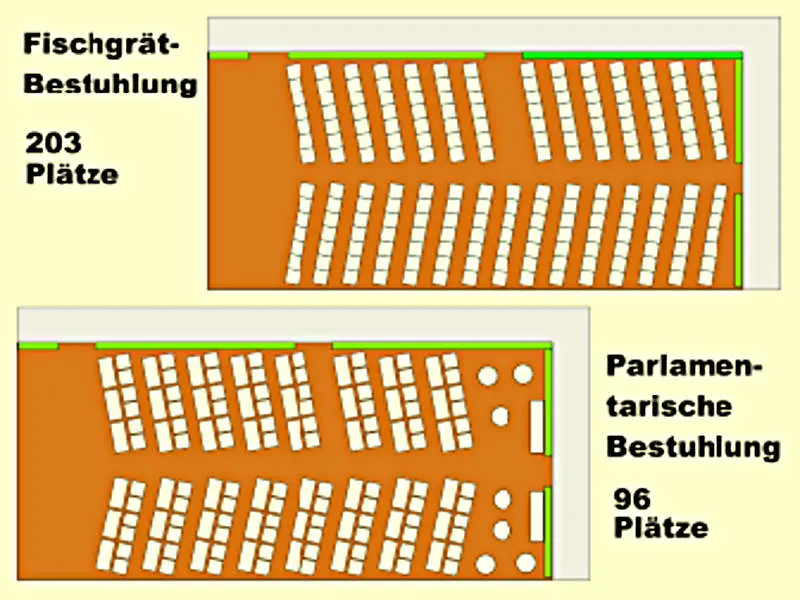 Beispiele für Fischgrät-Bestuhlung, parlamentarische Bestuhlung sowie eine Kombination mit Stehtischen.