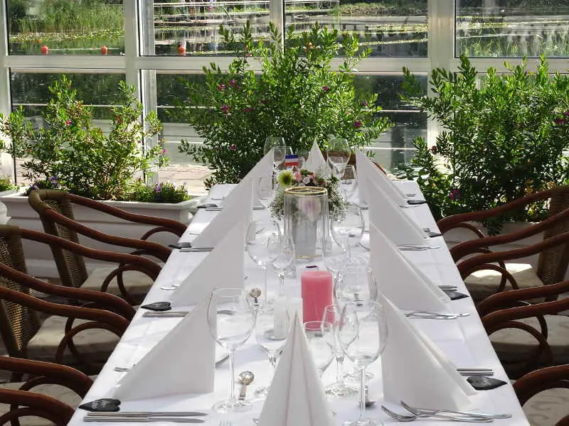 Im Regelfall stehen die Tische senkrecht zur Außenwand. Dann hat jeder Gast freien Blick auf den See.