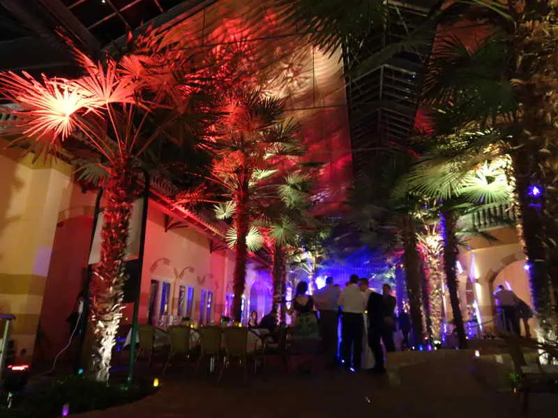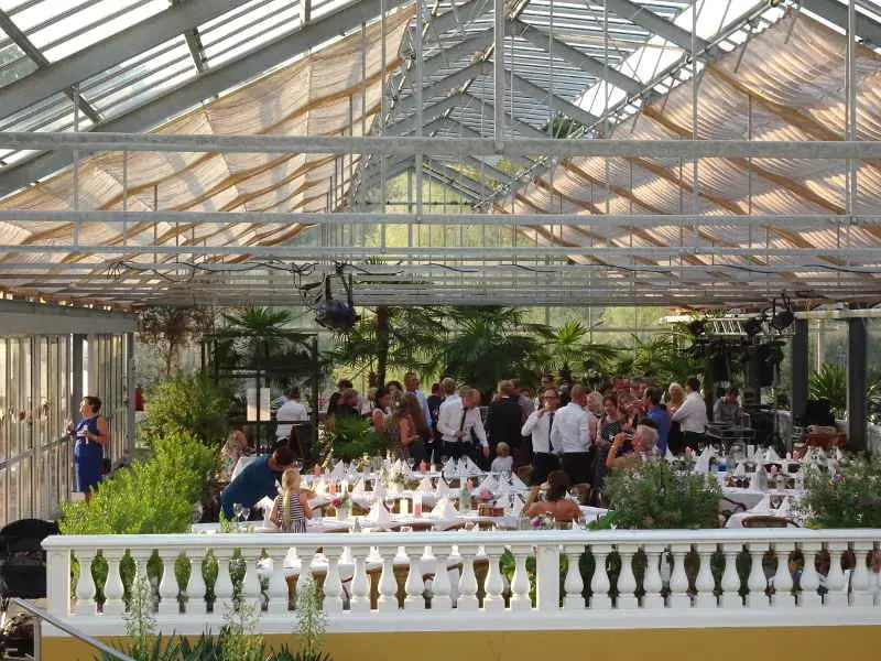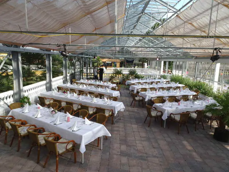 Unter der Decke der Seeterrasse wurde eine Infrarot-Heizung installiert. Rollschirme schließen dann die Flächen zur restlichen Palmenhalle. Die 54 kW reichen aus, um eine Temperaturdifferenz von etwa 10-15°C auszugleichen.