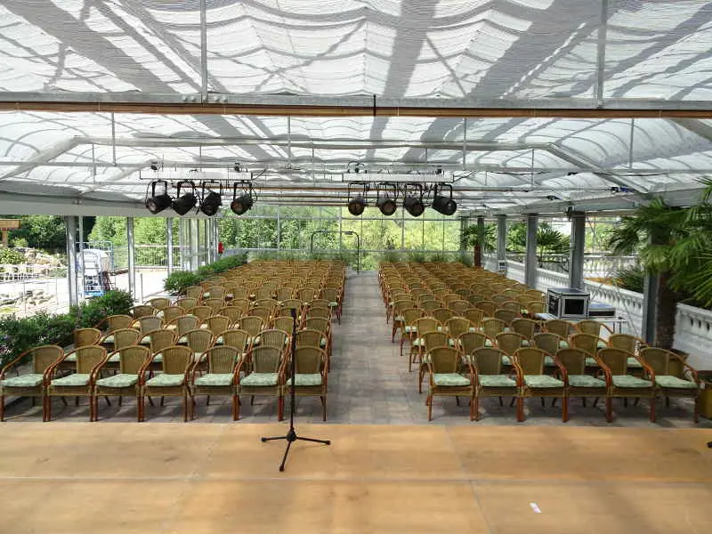 Innerhalb der 1.500 m² großen Palmenhalle übernimmt die Seeterrasse die Funktion einer flexibel nutzbaren Veranstaltungsfläche. Dort finden gleichermaßen Messen, Konzerte oder Feiern statt. Gleichzeitig bietet die Seeterrasse eine optimale Alternative, falls eine für die Tempelbucht geplante Feier wetterbedingt in die Palmenhalle verlegt werden muss.