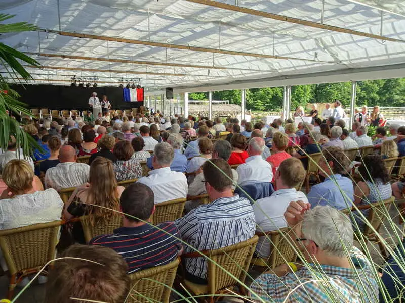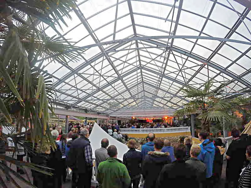 NaturaGart verfügt über eine Bühne in der Größe 8 x 4 m. Sie ist ca. 50 cm hoch und wird hinten und seitlich durch Geländer gesichert. Eine Rückwand kann eingebaut werden. Beleuchtung trägt die Stahlkonstruktion.