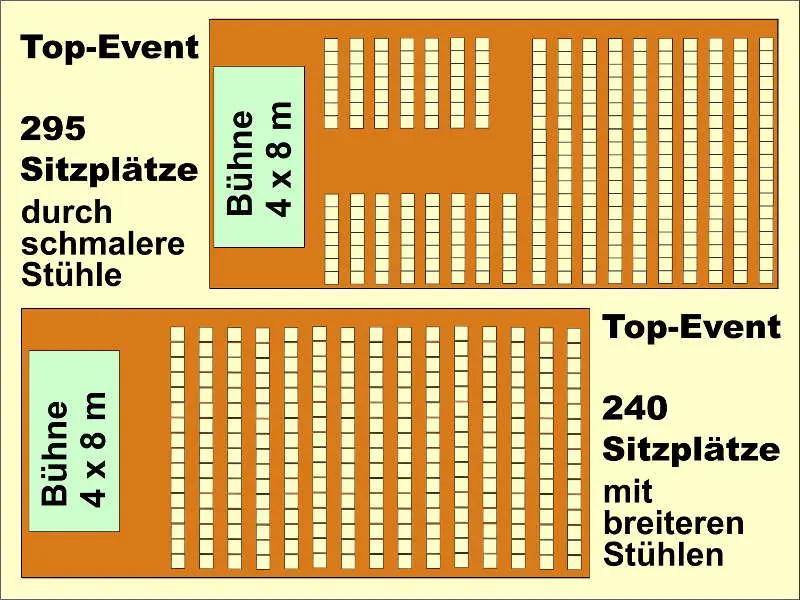 Bei versetzten Stuhlreihen verliert man ca. 17 Plätze. Die Gesamtzahl hängt ab von der Größe der Bühne.
