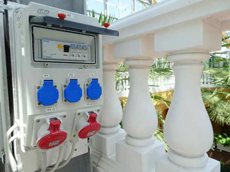 Zwei getrennt abgesicherte Stromverteiler mit jeweils 3 Steckdosen, die mit 16 Ampère abgesichert sind sowie 2 CEE-(Kraft-)Steckdosen, insgesamt jeweils 3 x 16 Ampère.