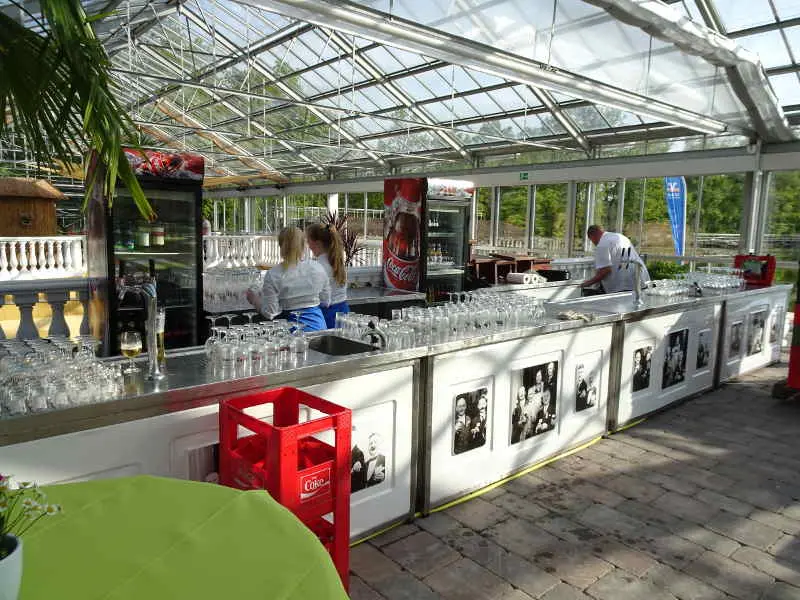 Für den Aufbau einer Theke gibt es die Anschlüsse im Bereich der Treppe. Für große Veranstaltungen können auch große Thekenanlagen hinzugemietet werden.