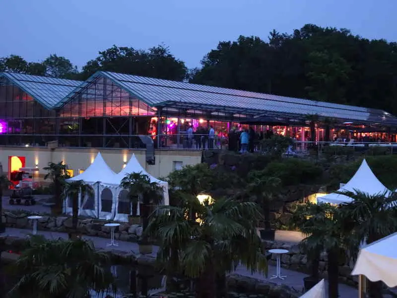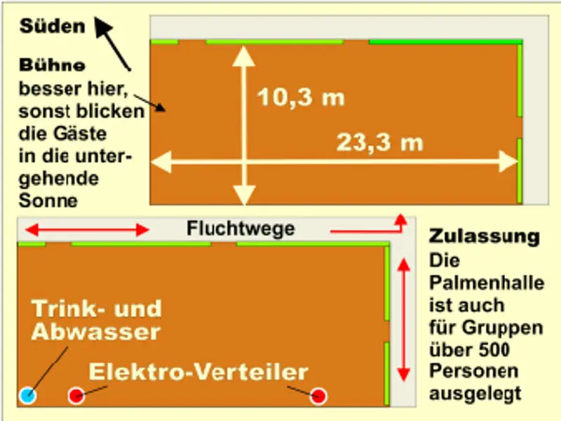 Ruhige Hintergrund-Musik ist kein Problem. Lauter Disco-Sound muss allerdings unter die Arkaden der Palmenhalle verlegt werden. Bei lauter Musik müssen die Türen an der Seeterrasse geschlossen bleiben.