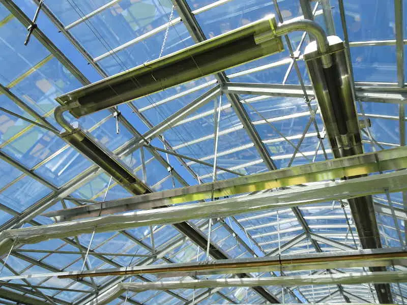 Unter dem Glasdach wird es schnell warm. Aus diesem Grunde gibt es große Firstfenster und weit zu öffnende Seitenwände. Unter dem Dach kann man vollflächig ein Schattiergewebe zufahren. Folge: Ein angenehmes Raumklima.