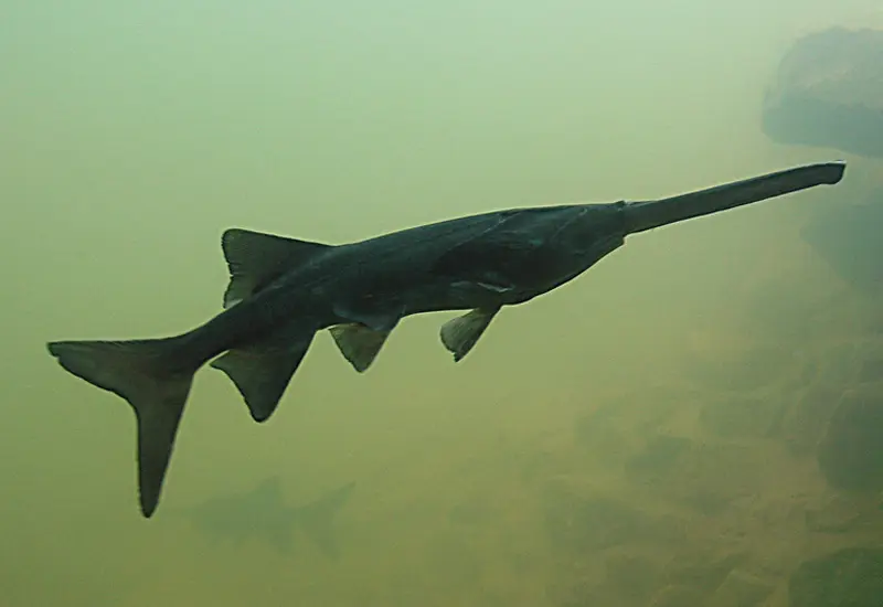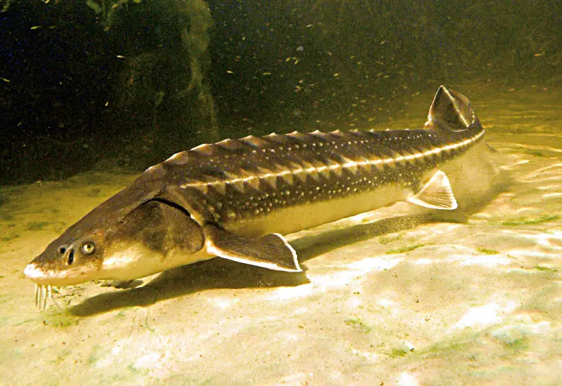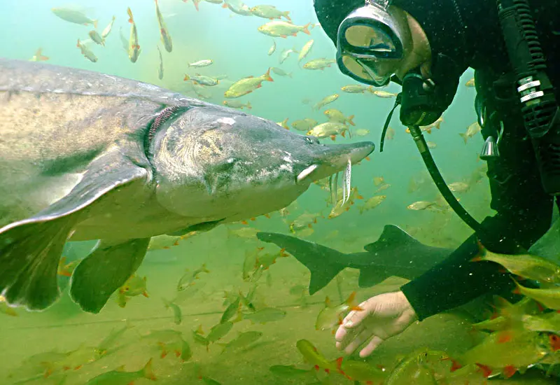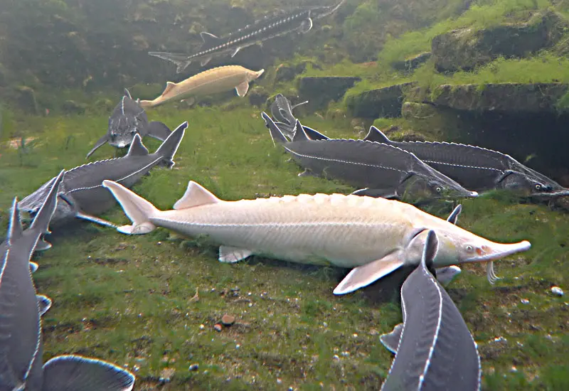 Für diese Störe muss man schon sehr große Teiche haben: Belugas werden über 8 m lang, die Amerikanischen Weißen Störe bringen es auf etwa 6 m. Im Park sind sie über 2 m lang.