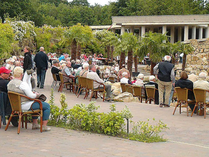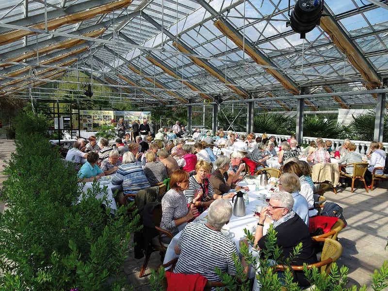 Nachmittags gibt es dann noch Kaffee und Kuchen. Wer später kommt oder länger bleibt, kann auch ein Buffet zum Abendessen vereinbaren. Es gibt überall Sitzplätze, viele auch in der überdachten Palmenhalle.