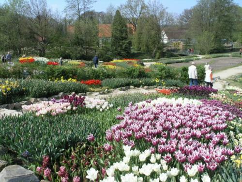 Da sich die Blütezeitpunkte der verschiedenen Pflanzenarten unterscheiden, ändert sich alle paar Tage der Anblick der großflächigen Blütenarrangements. Bereits Ende Februar beginnen die frühsten Frühlingsblüher zu blühen. Dazu zählen beispielsweise die Krokusse. Die Blütenpracht am Jahresanfang entspringt winterharten Herbstzwiebeln. Die farbenfrohen Blüten großer Zwiebelgewächse wie Tulpen und Narzissen bereichern den Garten bis in den Mai hinein.