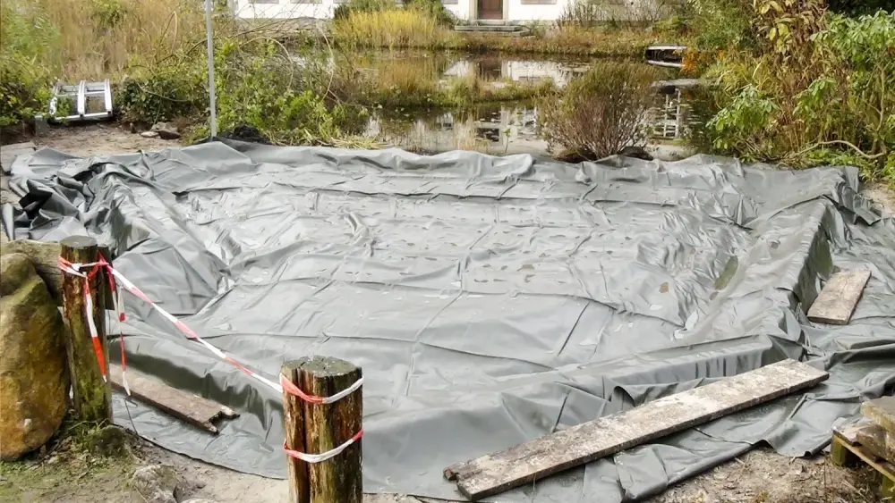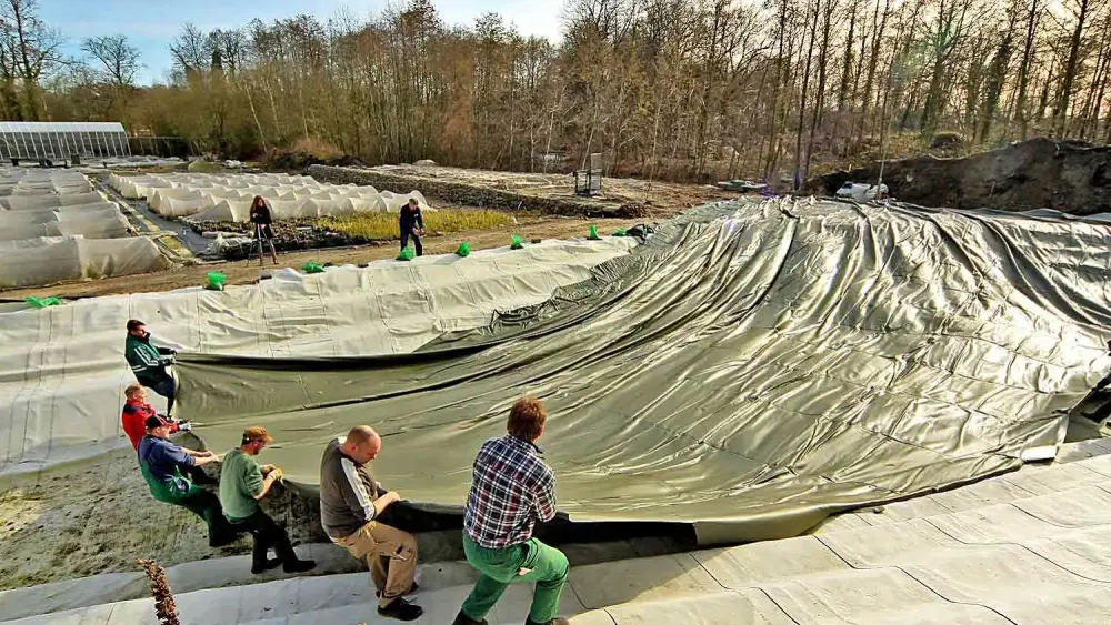Auch in den Wintermonaten kann man einen Teich bauen. Verlegung einer großen Teichfolie im Februar.