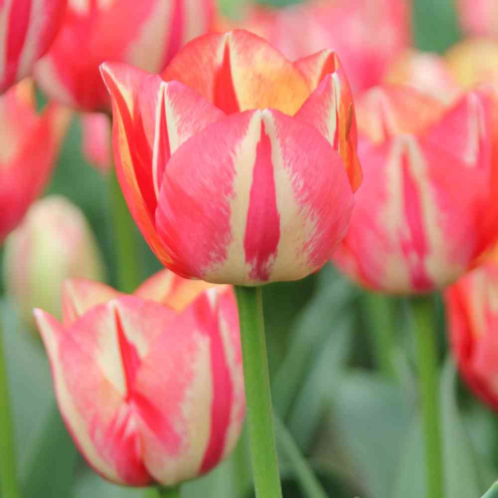 Triumphtulpen zählen zu den beliebtesten Frühjahrsblühern und zeichnen sich durch ihre robuste Natur und beeindruckenden Blüten aus. Spryng Break erreicht eine Höhe von etwa 40-50 cm und blüht mit einer auffälligen Kombination aus kräftigem Rosa und reinem Weiß. Ursprünglich aus den Niederlanden stammend, gehört diese Sorte zu den Klassikern unter den Zwiebelpflanzen.