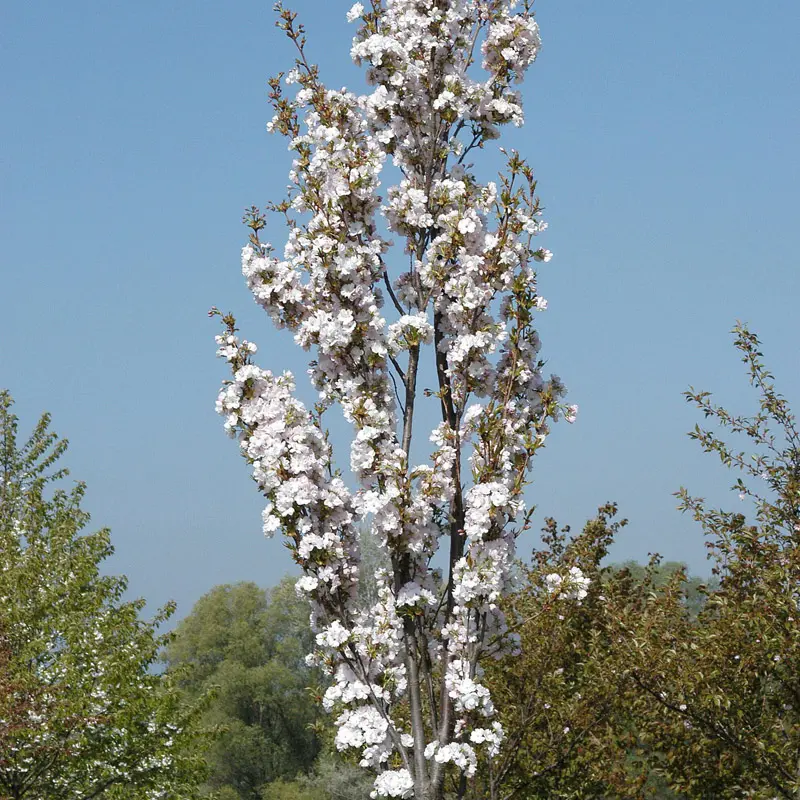 - Säulen-Zier-Kirsche: Die Säulen-Zier-Kirsche ist ein strahlender Frühlingsbote mit dicht gefüllten, rosa Blüten. Ihr schlanker, aufrechter Wuchs macht sie zur perfekten Wahl für kleine Gärten oder zur Schaffung von vertikalem Interesse in gemischten Pflanzungen.