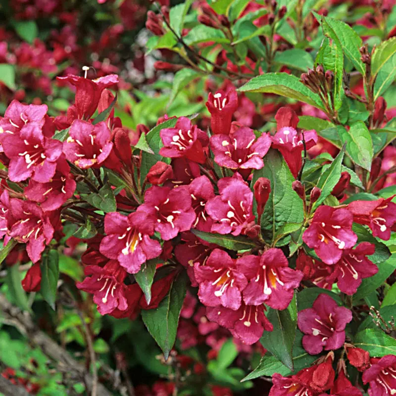 Weigelie: Die Weigelie, auch bekannt als Weigela florida, ist ein aufrechter, sommergrüner Strauch mit bogigen Zweigen und trichterförmigen, rosa Blüten, die im späten Frühling und frühen Sommer erscheinen. Die Blätter sind elliptisch und dunkelgrün, und im Herbst nehmen sie eine attraktive purpurrote Färbung an.