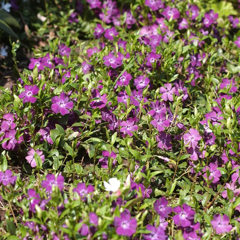 - Immergrün, lila: Das lila Immergrün ist ein wahrer Blickfang in jedem Garten. Seine leuchtenden lila Blüten, die im Frühjahr und Sommer erscheinen, setzen farbenfrohe Akzente in schattigen Gartenecken. Dieser pflegeleichte, immergrüne Bodendecker eignet sich hervorragend, um kahle Stellen zu bedecken und dem Garten das ganze Jahr über eine strukturierte Grünfläche zu verleihen. Darüber hinaus bietet er einen effektiven Erosionsschutz auf schwierigen Böden.
