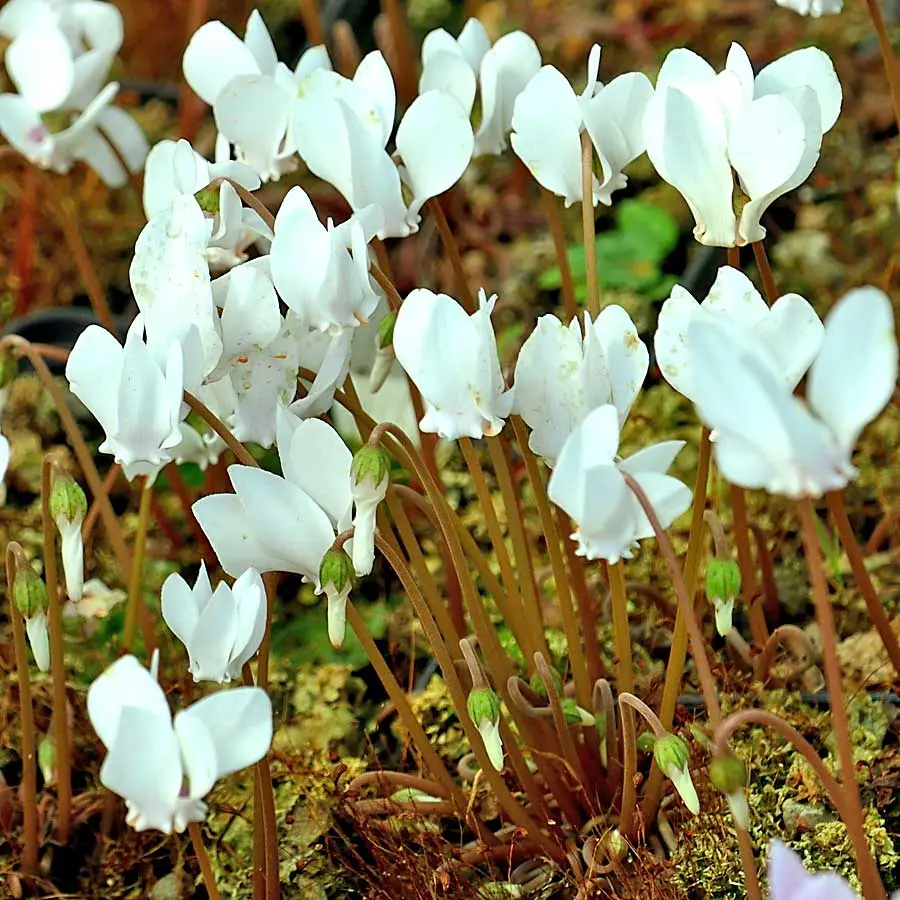 - Mini-Alpenveilchen, weiß: Das Mini-Alpenveilchen, weiß, ist bekannt für seine anmutigen, weißen Blüten, die über dem dunklen Laub schweben. Es eignet sich perfekt als bodennahe Ergänzung zu Hecken, wo es einen charmanten Farbtupfer bietet und den Gartenbereich mit seiner zierlichen Eleganz bereichert.