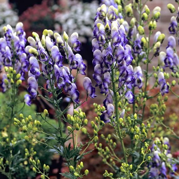 Blau-weiß, ungefüllt, helmförmige Einzelblüten zu großen Rispen angeordnet, Juli bis August