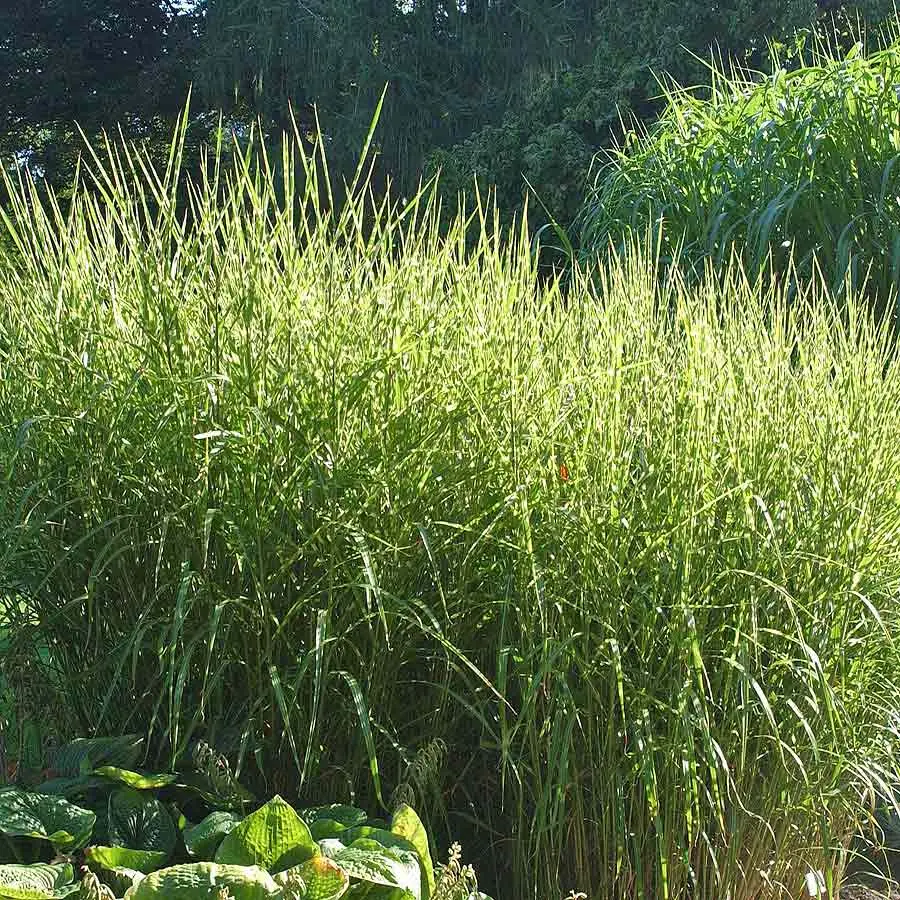 Riesen-Chinaschilf (Miscanthus x giganteus) Ein imposantes Gras, das seinem Namen alle Ehre macht. Mit einer beeindruckenden Höhe von bis zu 3,5 Metern bildet es einen natürlichen Sichtschutz und setzt markante Akzente im Garten. Seine goldgelben Herbsttöne sind ein weiteres Highlight.