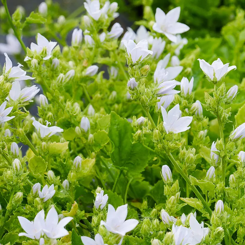 Karpaten-Glockenblume weiß: Die Glockenform dieser Blume fängt Tau und Feuchtigkeit auf, was sie ideal für das Bachumfeld macht. Ihre tiefen Wurzeln helfen, den Uferboden zu stabilisieren, und ihre hellen Blüten setzen strahlende Akzente in der grünen Uferlandschaft.