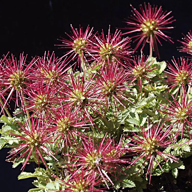 - Stachelnüsschen, rot: Dieses rote Stachelnüsschen bietet mit seinem kupferfarbenen Laub und den roten Fruchtständen eine auffallende Farbgestaltung. Es ist ideal für Steingärten und als Bodendecker, wo es robust und pflegeleicht zugleich ist.