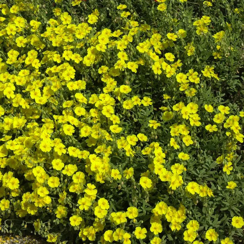 Sonnenröschen, gelb: Dieser aus Südeuropa stammende Zwergstrauch erstrahlt im Sommer mit leuchtend gelben Blüten, die auf einem Bett aus kleinen, grünen Blättern sitzen. Es bringt Wärme und Lebendigkeit in das Teichumfeld und unterstützt das Ökosystem durch Anziehung von Bestäubern.
