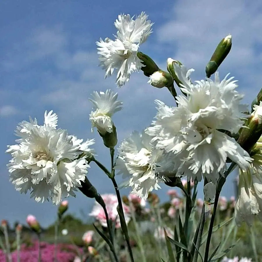 Feder-Nelke, weiß: Eine südeuropäische Schönheit, die mit ihren gefiederten, reinweißen Blüten auf schlanken Stielen beeindruckt. Sie bietet einen eleganten Kontrast im Teichumfeld und zieht mit ihrer Blütenpracht Schmetterlinge und andere Bestäuber an.