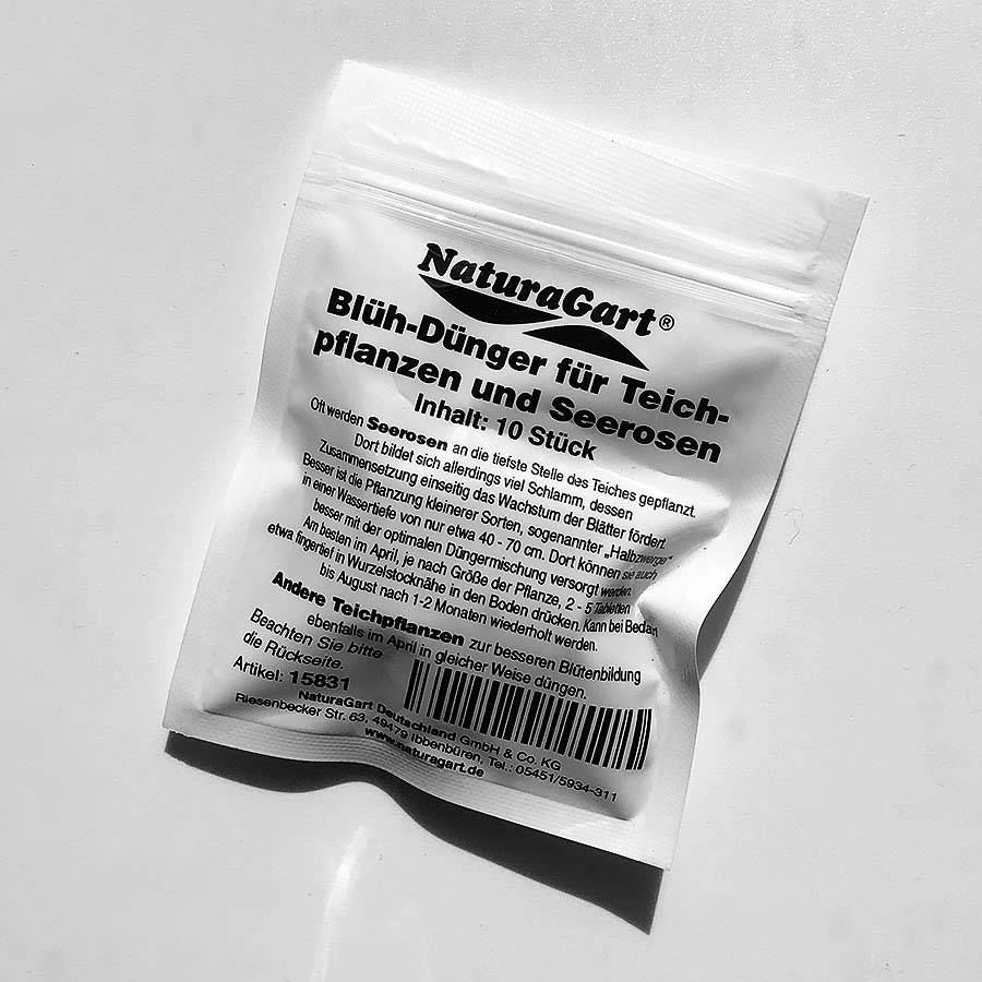 Viele Teichpflanzen und Seerosen wachsen auf nährstoffreichen, schlammigen Böden. Diese Bedingungen gibt es in den meisten Teichen nicht, was zu Anwachsproblemen führen kann. Dieser Spezial-Dünger sorgt für eine ausgewogene Düngung und damit besonders auch bei Seerosen zu einer viel besseren Blütenbildung. Der Dünger ist für Fische ungiftig und bei trockener Lagerung unbegrenzt haltbar.