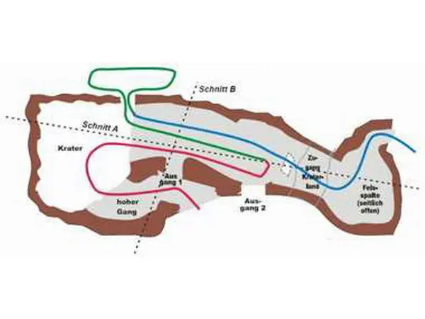 Ein hoher Gang führt in einen 'Kraterschlot'. Von dort zweigen mehrere etwa 2 m hohe und 3 m breite Gänge ab. Bleibe zunächst auf der Sohle und durchtauche den unteren Gang (rote Linie). Nach 3 Metern gibt es eine Verbindung zum benachbarten hohen Gang, durch den Du gekommen bist (Ausgang 1).