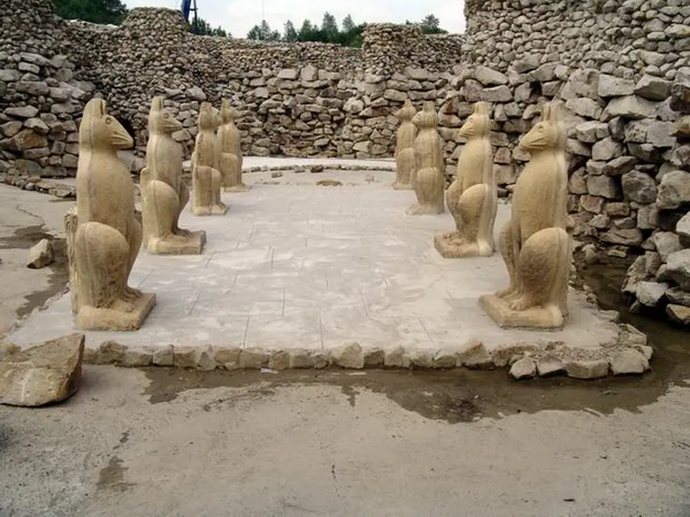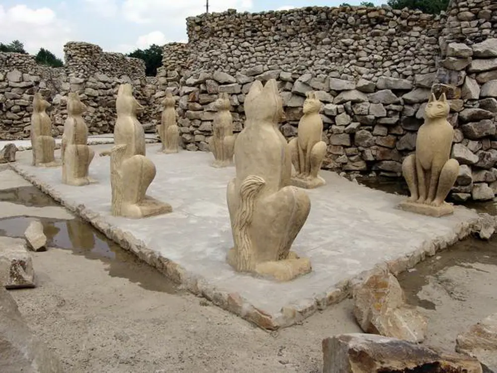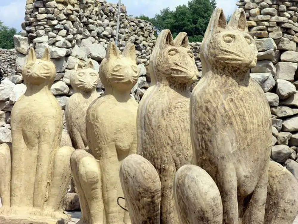 Katzenfiguren säumen den Zugang