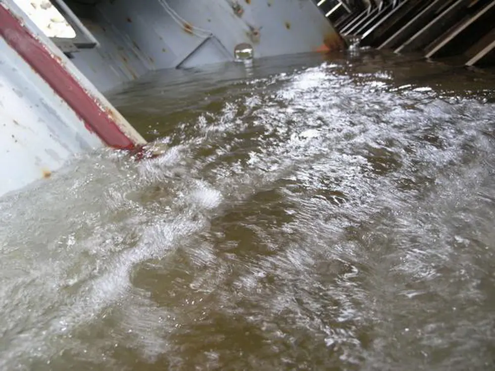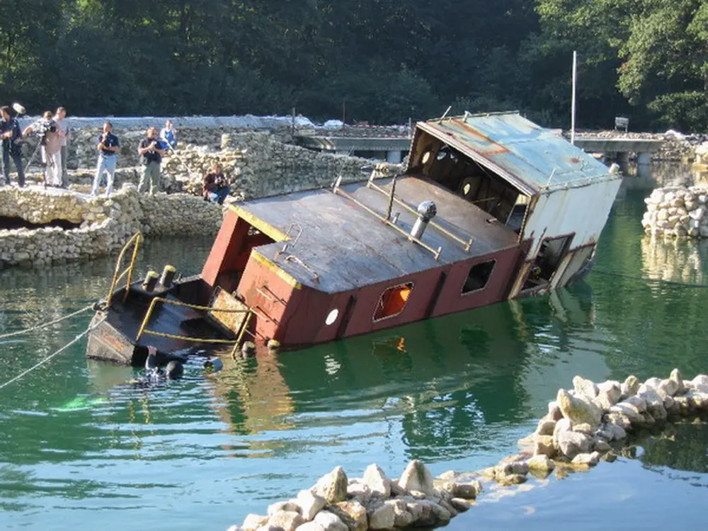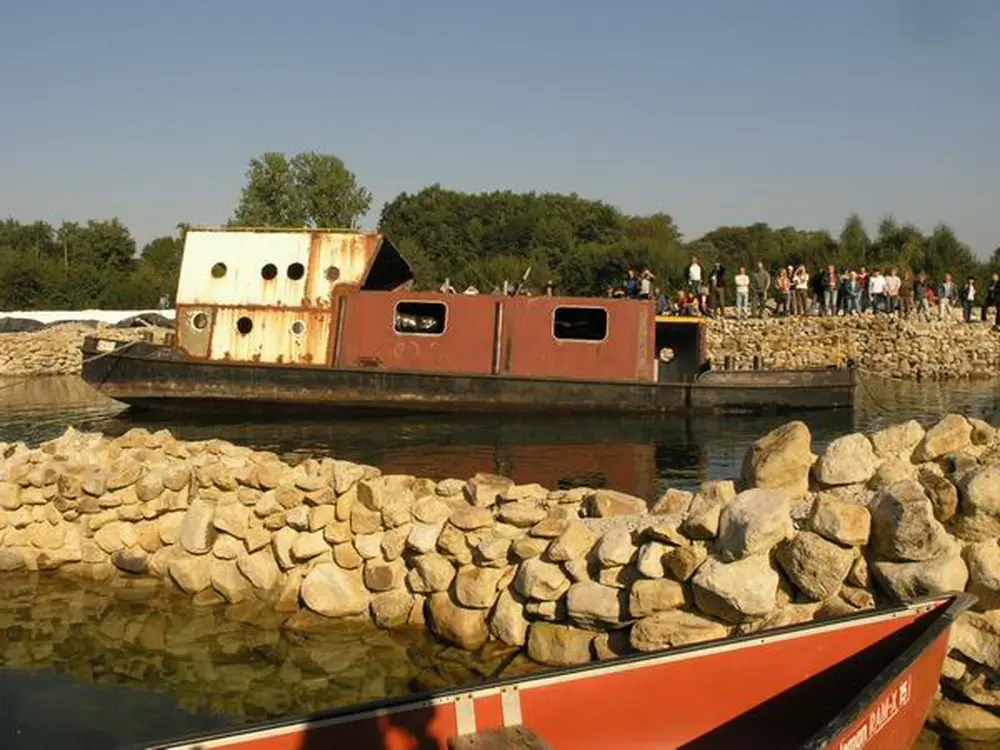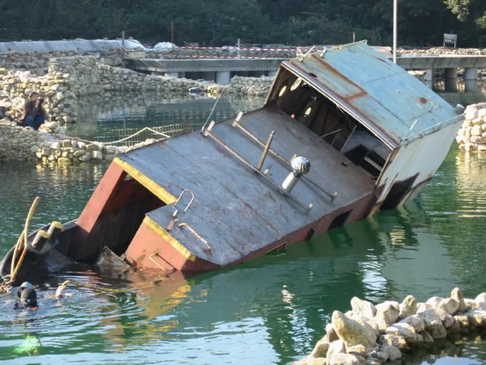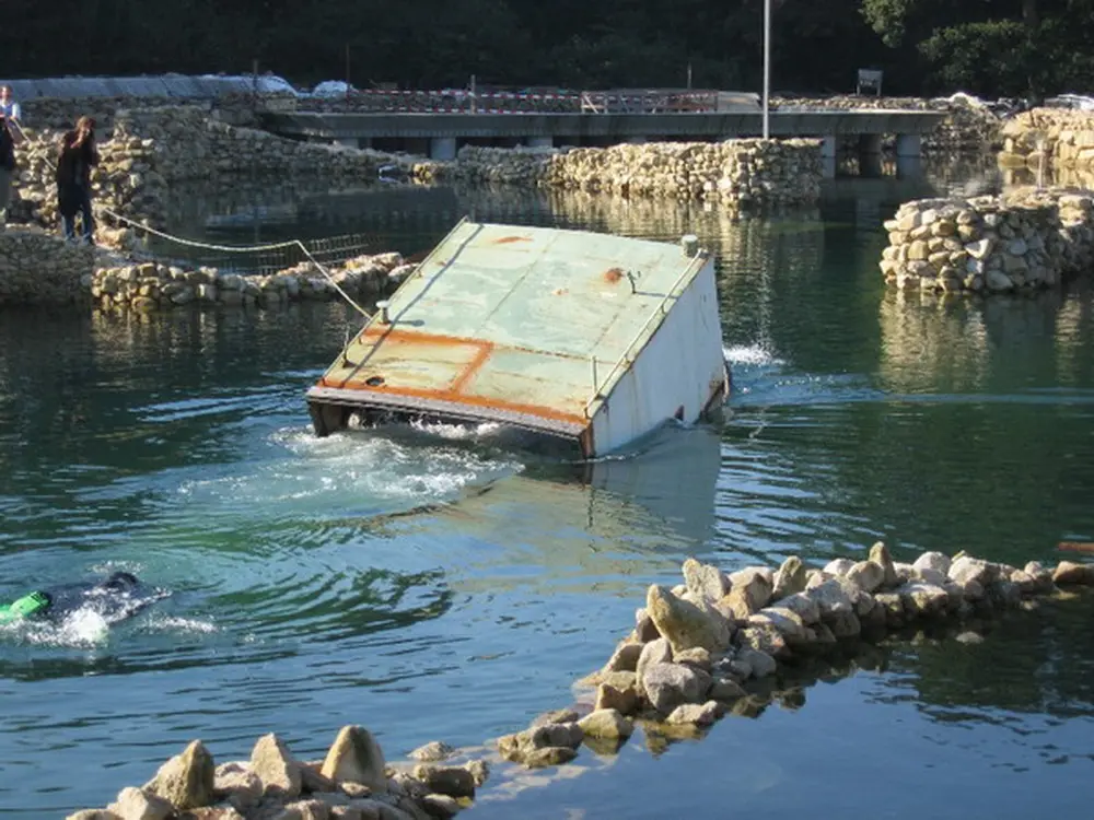 Es war klar, daß es seitlich absacken und sich auf dem Weg nach unten überschlagen würde. Dort wäre es dann vielleicht auf dem Dach gelandet. Nach der erfolgreich medienwirksamen Erstversenkung des Schiffs haben wir den See noch einmal trockengelegt und weitere Baumaßnahmen durchgeführt. Wir haben das Schiff dann wieder abgedichtet, aufschwimmen lassen und, weil es so schön war, ein zweites Mal versenkt.