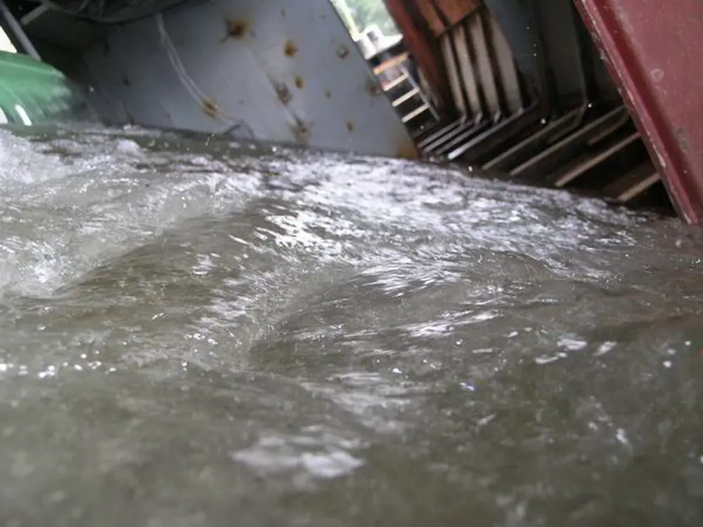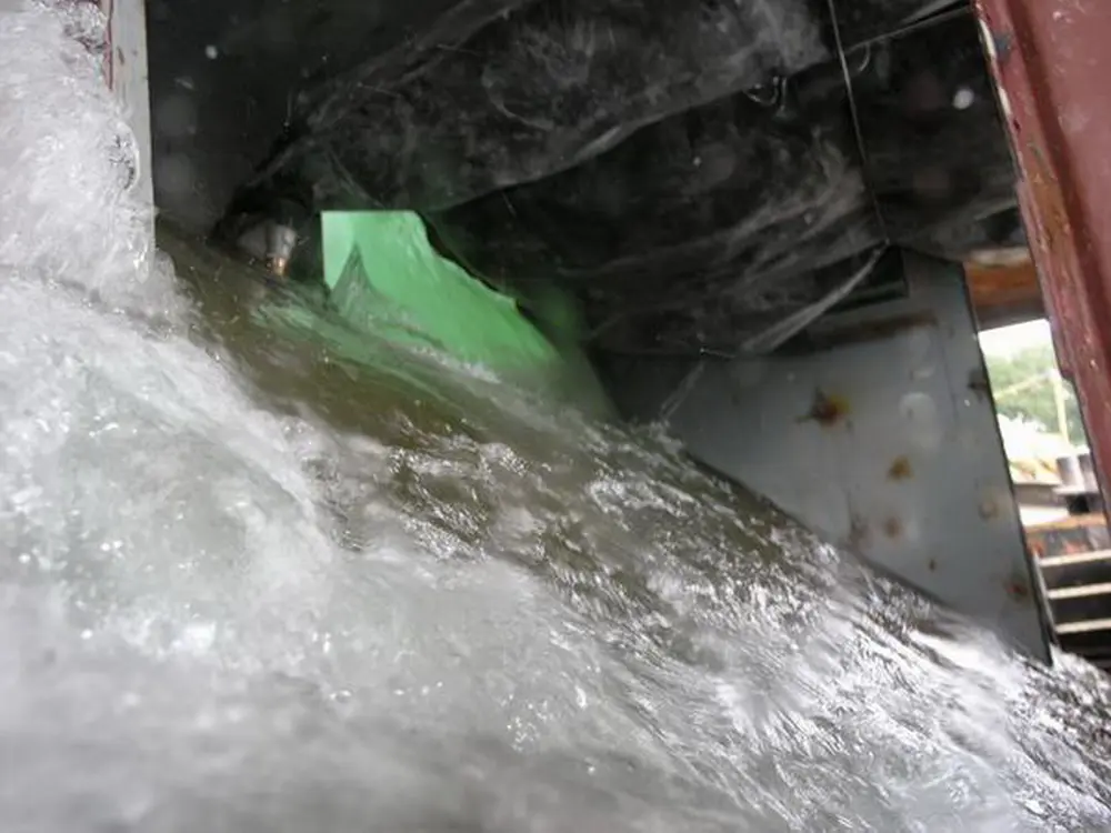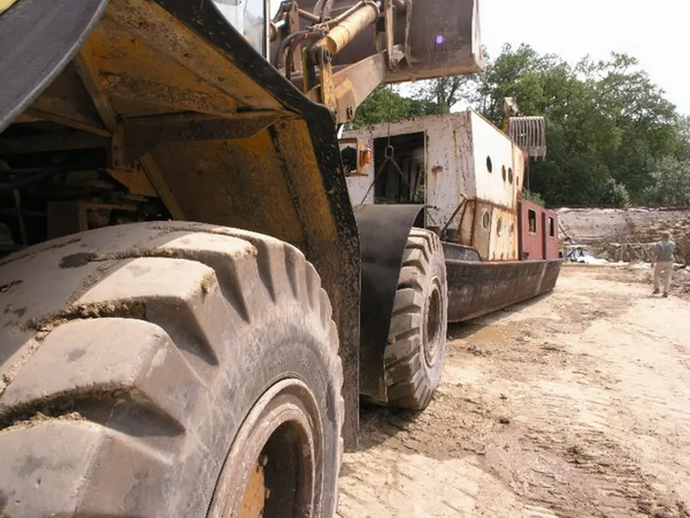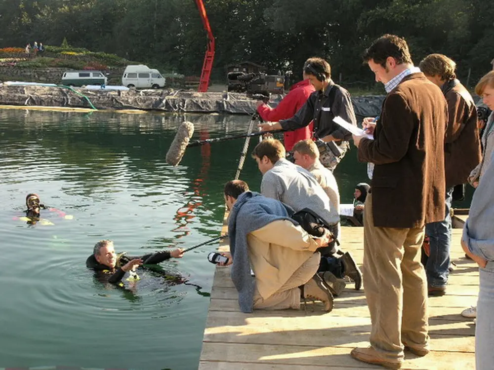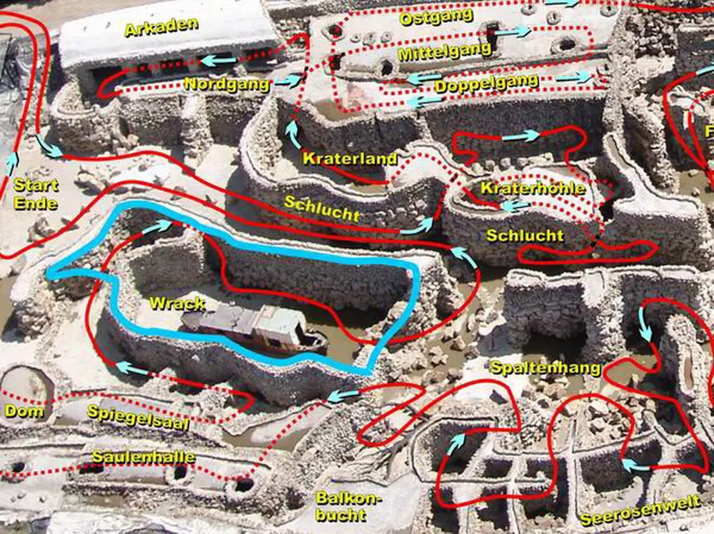 Es war klar, daß es seitlich absacken und sich auf dem Weg nach unten überschlagen würde. Dort wäre es dann vielleicht auf dem Dach gelandet. Nach der erfolgreich medienwirksamen Erstversenkung des Schiffs haben wir den See noch einmal trockengelegt und weitere Baumaßnahmen durchgeführt. Wir haben das Schiff dann wieder abgedichtet, aufschwimmen lassen und, weil es so schön war, ein zweites Mal versenkt.