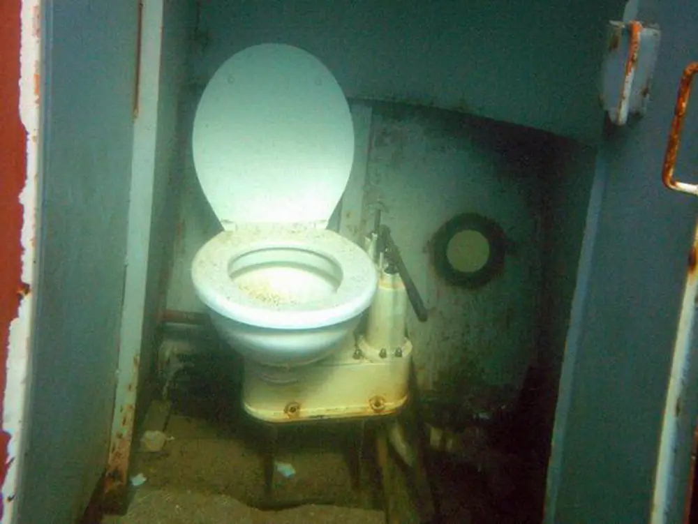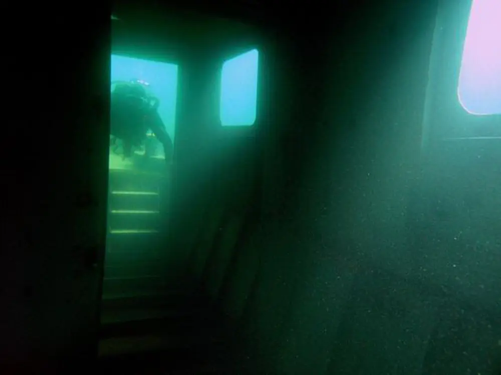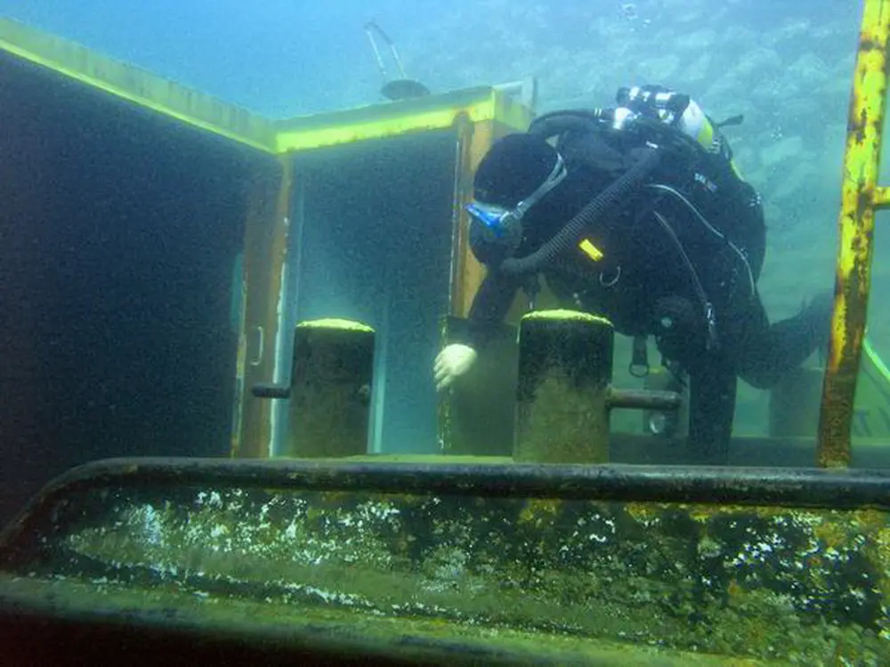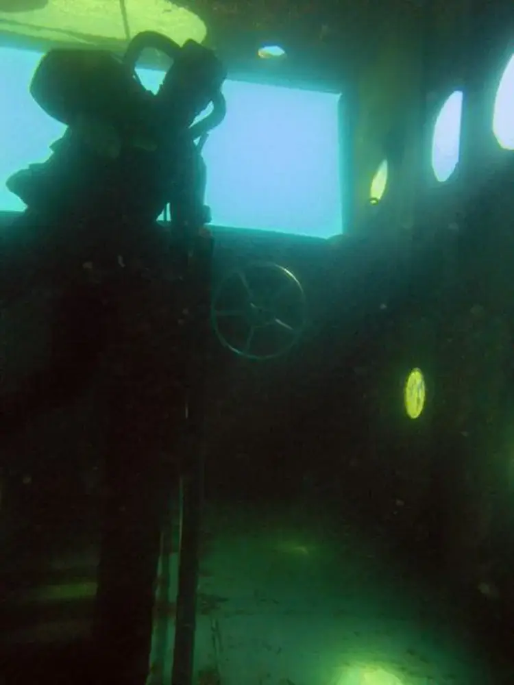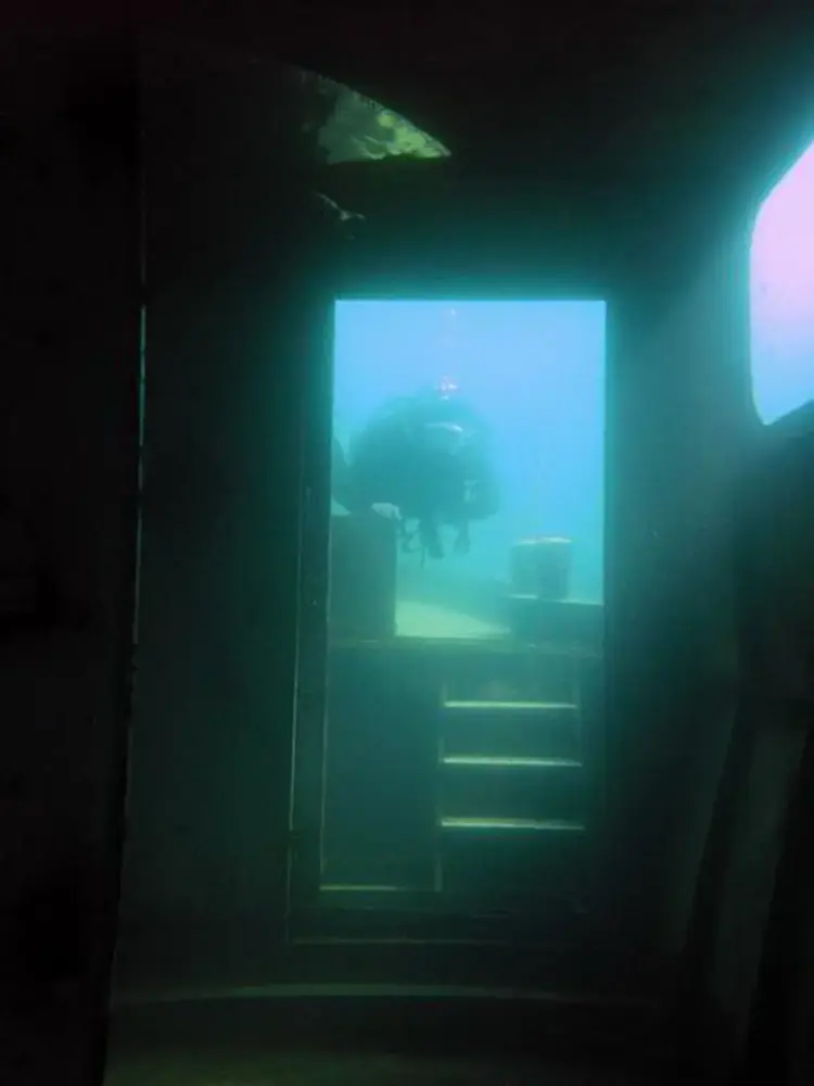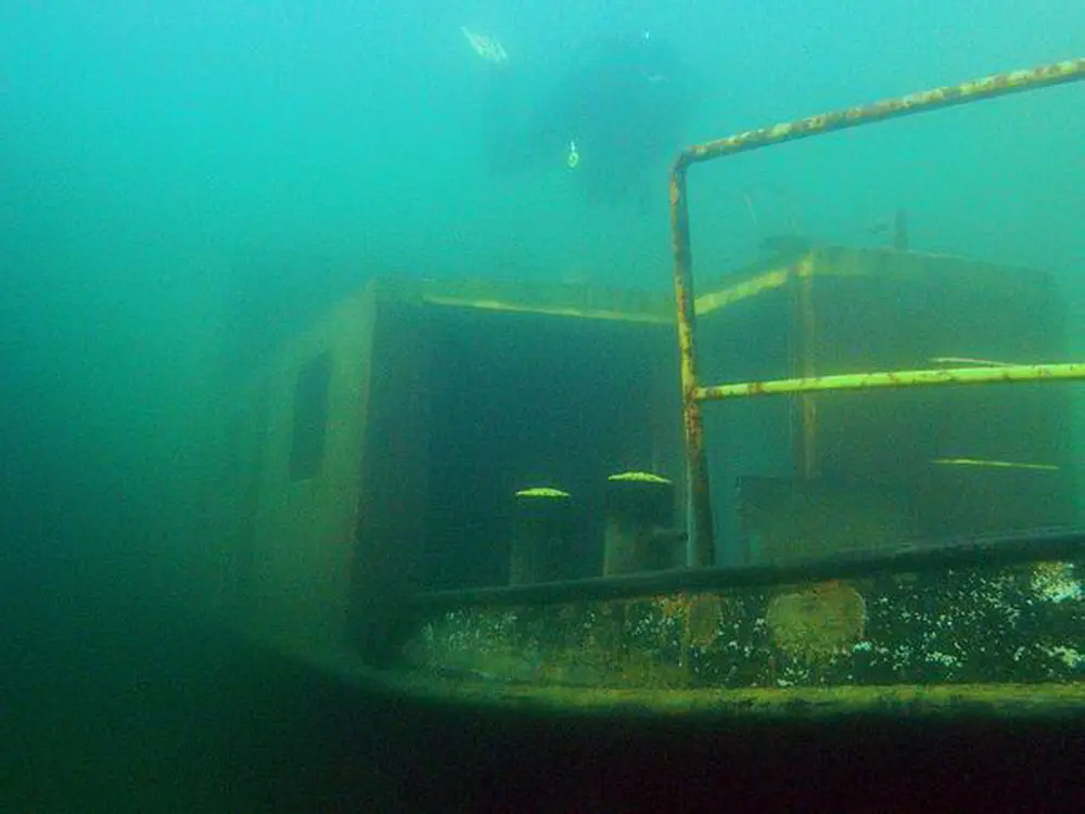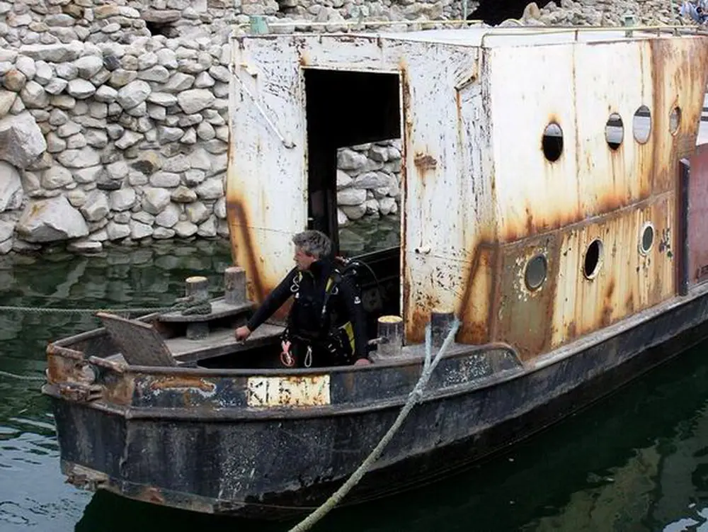 Versunkene Schiffe stehen auf dem Wunschzettel vieler Taucher ganz weit oben. Und so haben auch wir ein altes Kanalschiff besorgt, das ursprünglich als Generatorschiff für Baustellen eingesetzt wurde. Wir haben den 13 m langen Kahn dann mit einem Steuerhaus versehen und ihm so das Design eines richtigen Schiffes verpaßt. In einer spektakulären Medienaktion haben wir den Kahn dann versenkt. Das war etwas kritischer, als es zunächst den Anschein hatte. Durch den Toilettenraum ist das Schiff asymmetrisch gebaut.