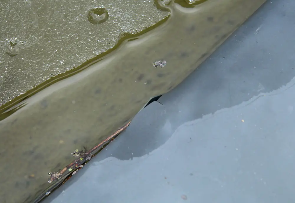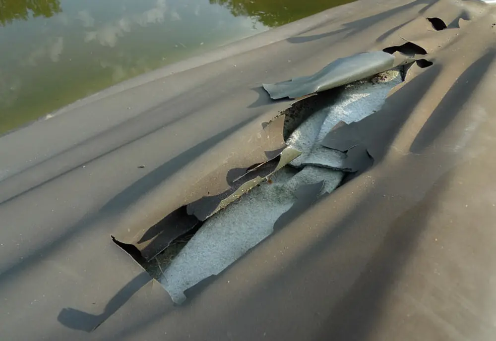 Der ständige leichte Wellenschlag führt dazu, dass Uferaufbauten über die Jahre ins Rutschen geraten. Dadurch wird die Folie stellenweise kahl - ein Zustand, der UV-Schäden, Frostschäden und mechanische Belastungen stark beschleunigt.
