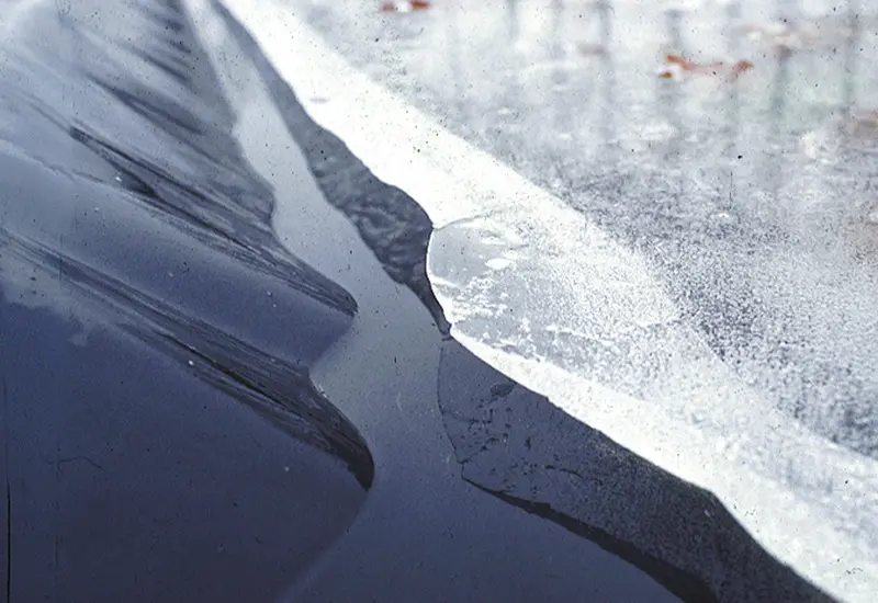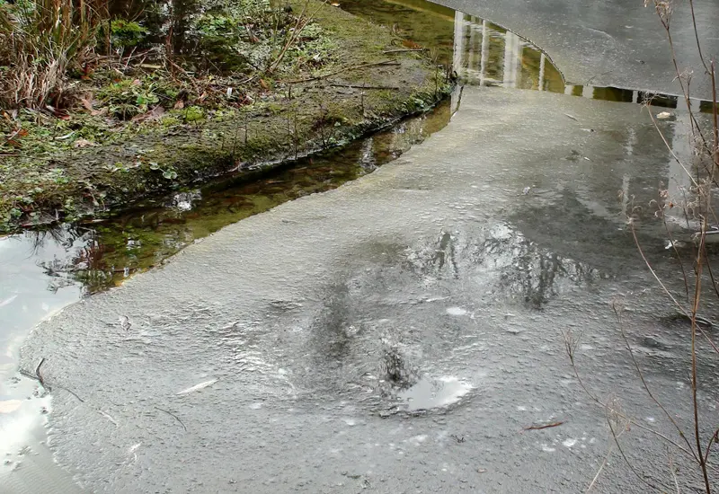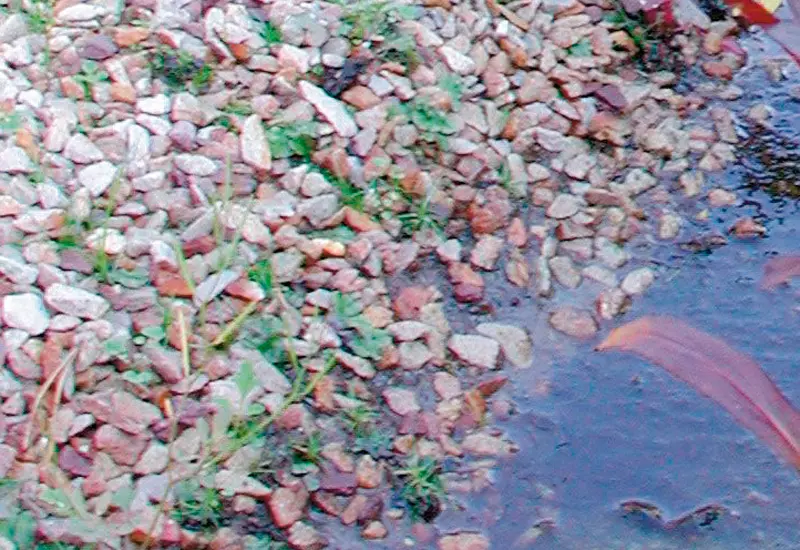 Steine und Kies können bei Frost Splitter bilden, die später durch Eis oder Schuhe in die Folie gedrückt werden.