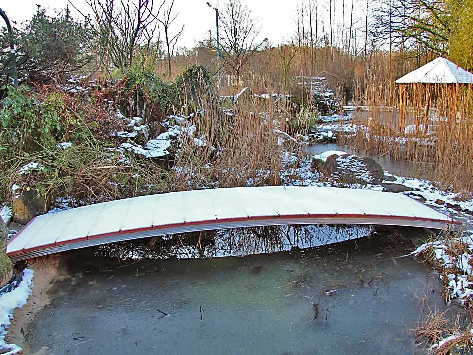 Ein Steg liegt in der Regel am Ufer an und ragt freitragend ein Stück über das Wasser. Eine Brücke überspannt den Teich oder Graben vollständig, oft mit beidseitiger Geländermöglichkeit und größeren Spannweiten. Technisch basieren beide auf den gleichen Aluminium-Tragprofilen, unterscheiden sich aber in Geometrie, Auflagerpunkten und Geländer-Ausführung.