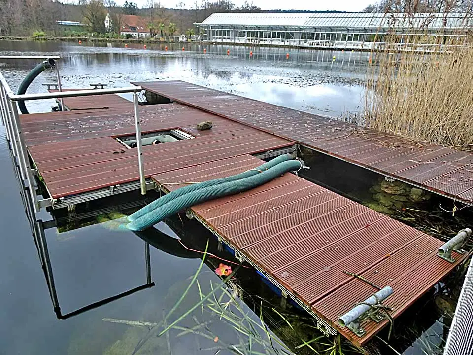 Aus Stegträgern und PE-Brettern gebaut: Schwimm-Ponton im Unterwasserpark.